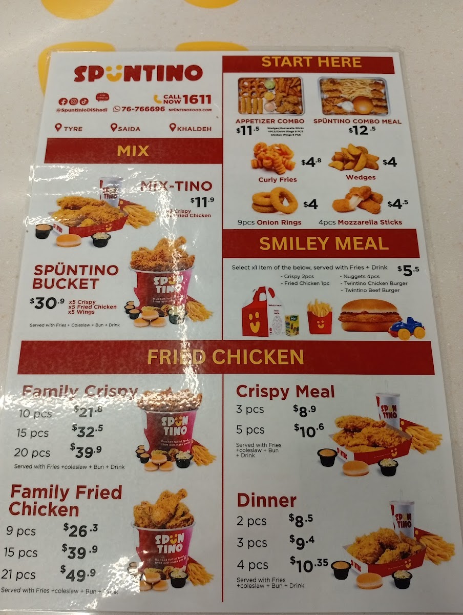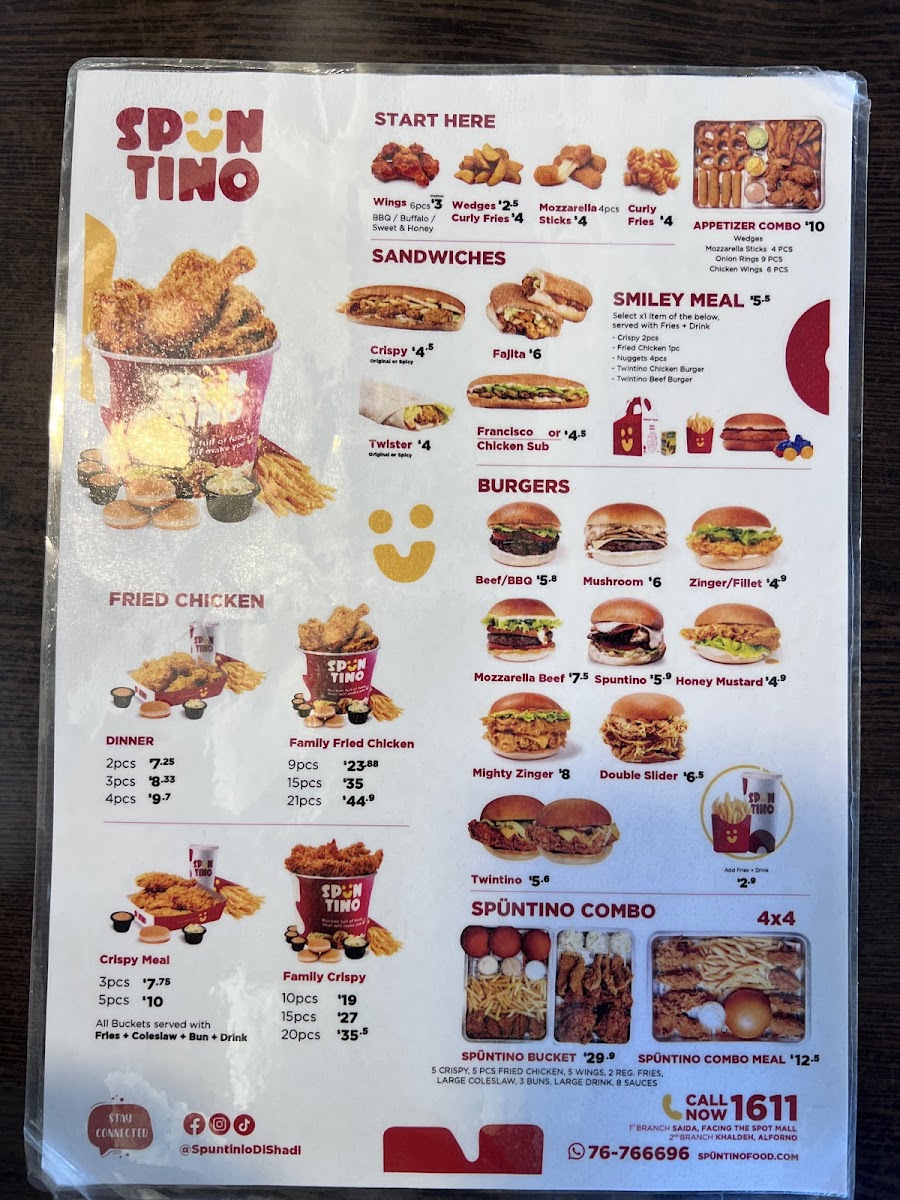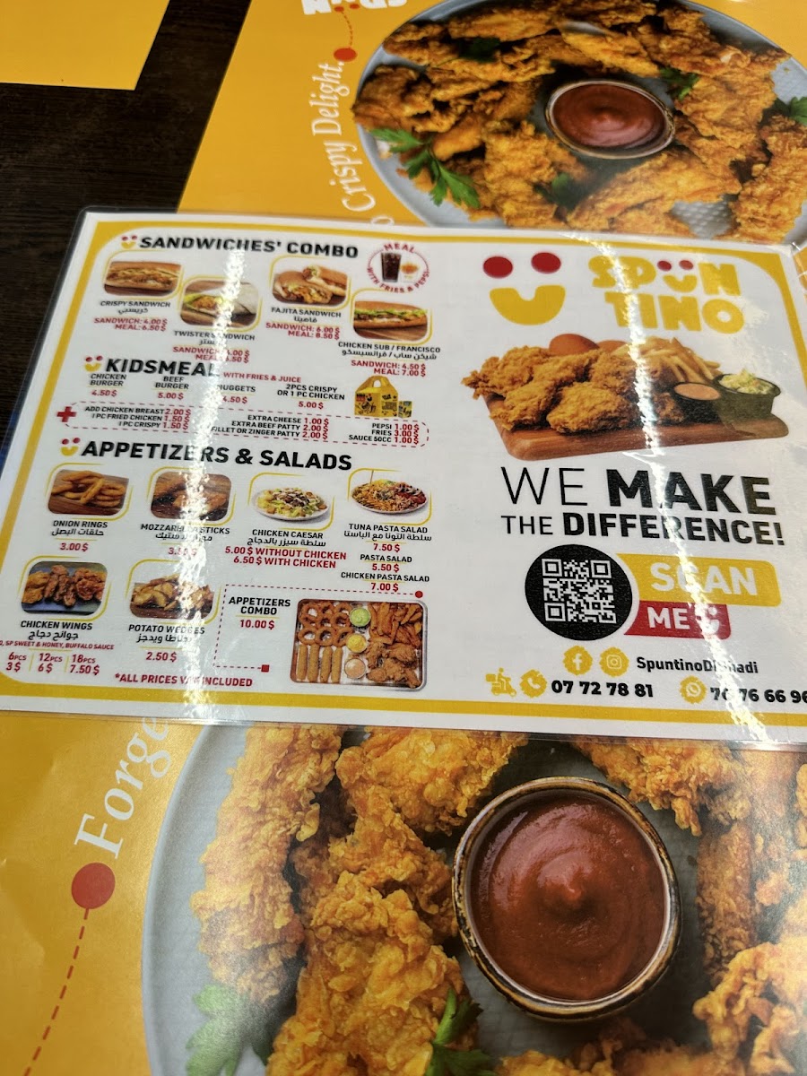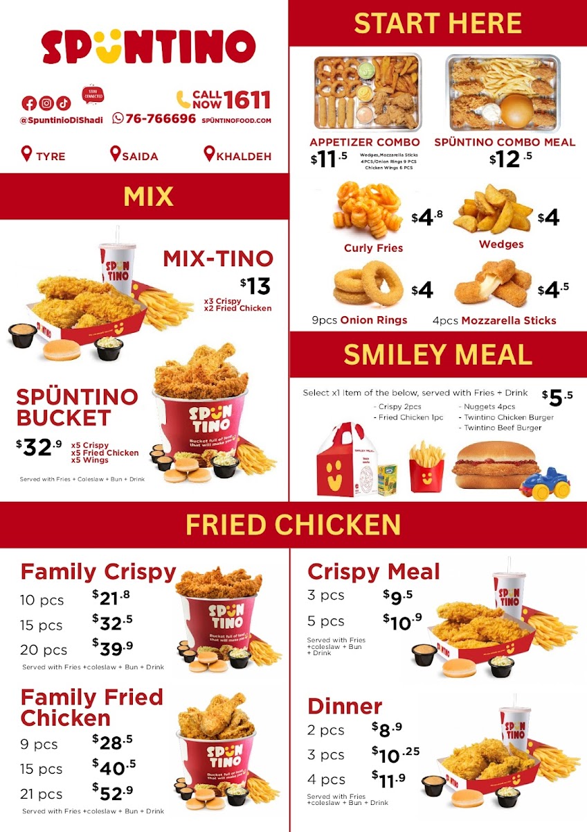 The menu at Spüntino Di Shadi in Sidon, Lebanon, offers a variety of satisfying options that appeal to diverse tastes. The standout dishes are hearty, flavorful, and perfect for sharing. Crispy Chicken Strips and Fries is a crispy, golden-fried option that pairs perfectly with the restaurant’s signature dipping sauces. For families, the Family Offer provides a great way to enjoy a mix of dishes, ensuring everyone has something to enjoy. If you're in the mood for a filling burger, the Mozzarella Beef Burger offers a delightful combination of juicy beef and creamy mozzarella, served with a side of crispy fries. For those craving comfort food, Cheesy Fries are the ultimate indulgence, topped generously with melted cheese. The Caesar Salad and Futucini provide a refreshing, balanced meal with fresh greens and pasta, ideal for lighter appetites. The Chicken Sub Sandwich Combo is another satisfying choice, featuring tender chicken in a soft sub roll with all the delicious extras, while the Chicken Crispy delivers a crunchy, savory experience that never disappoints. These menu items, with their rich flavors and satisfying portions, make Spüntino Di Shadi a reliable destination for a delicious and fulfilling meal.